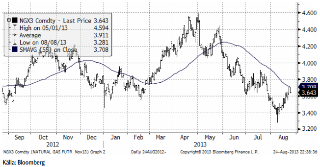 Naturgaspriset har varit fallande sedan maj, men har rekylerat upp i augusti. Vi tror att det handlar om just en rekyl och att priset kommer att vända ner igen.