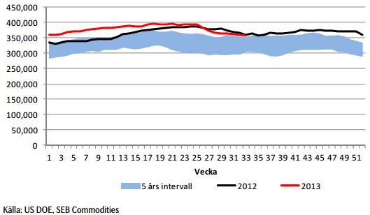 Råoljelagren i USA, som vi vant oss vid att se på en hög nivå, har fallit och ligger nu under förra årets nivå och nära det femåriga intervallet för åren 2007 – 2011. Nedan ser vi amerikanska råoljelager enligt DOE i tusen fat. Den svarta kurvan är 2012 års lagernivåer vecka för vecka och den lilla röda linjen är 2013 års nivå.