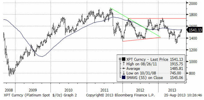 Platina har stigit upp till ett tekniskt motstånd, där priset har vänt ner tidigare i år. Nedan ser vi ett veckochart för de senaste fem åren. Det är ett otydligt läge, där motståndet som finns vid dagens nivå spelar en avgörande roll.