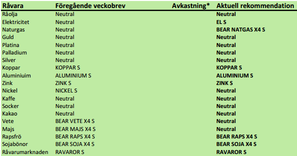 *) Avkastningen lämnar vi blank här eftersom det har varit ett två månaders uppehåll. Generellt sett har dock rekommendationerna varit lyckosamma med kraftiga nedgångar i priset på t ex spannmål och oljeväxter och prisuppgång på basmetaller.