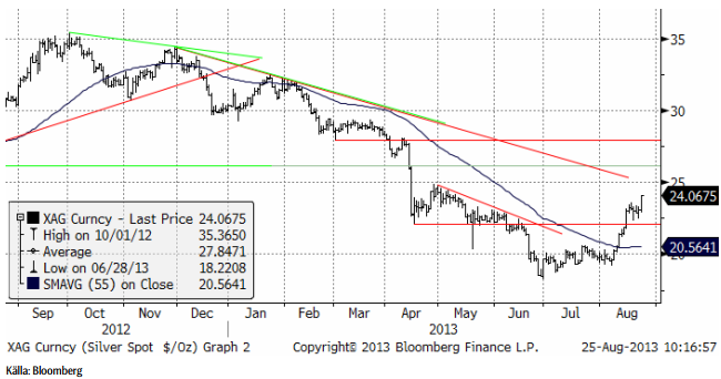 Nedan ser vi kursdiagrammet för silver i dollar per troy ounce. I fredags bröt priset upp från en flagga. Flagg-formationer ser man ofta i efterhand ”på halv stång”, dvs i mitten av en uppgång. Detta gör att prisuppgången skulle kunna nå upp till 27 dollar per ozt. Å andra sidan finns ett starkt motstånd redan vid 25 dollar, där rekylen uppåt i april tog slut.