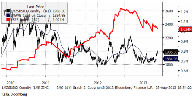 Fundamentalt har zink i flera år varit överskott, dvs produktionen har varit större än konsumtionen. Enligt ILZG visade det första halvåret i år ett överskott på 44,000 ton. Det ska jämföras med överkottet på 157 ton förra året. ”Bull caset” på zink, som baserar sig på att en betydande gruvkapacitet kommer att stängas de närmaste åren, är fortfarande intakt. Gruvor med 1.5 mt produktion per år väntas stänga under perioden 2013 – 2016. 450,000 ton gruvproduktion förväntas bli nedlagd under 2013 –