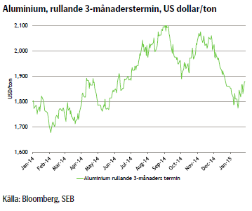 Den fundamentala situationen är annorlunda för den lätta metallen. Efter år av för stort utbud börjar marknaden komma i balans och snarast vända till större efterfrågan än utbud, vilket står i kontrast till just marknaden för koppar. US-dollarns appreciering i kombination med prisfallet i olja satte dock i slutet av förra året press nedåt på aluminiumpriset och mönstret har fortsatt även i början av detta år.