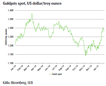Guldpris  spotFörra veckan rekommenderade vi en investering i guld genom certifikatet BULL GULD X4S. Trots den starka dollarn steg guldpriset och certifikatet, noterat i svenska kronor, gav en avkastning på drygt två procent. US-dollarn stärktes gentemot bland annat kronan då ECB tog ett historiskt beslut att stimulera tillväxten i eurozonen via ett mycket stort och omfattande stödköpsprogram av obligationer, vilket skall fortgå fram till september 2016. Euron föll till den lägsta nivån mot dollarn på elva år. Att sedelpressarna går varma och papperspengar förlorar sitt värde ger stöd åt guldpriset. På kort sikt tror vi emellertid att vi kommer att se en korrektion vilket gör att vi idag tar hem vår vinst.