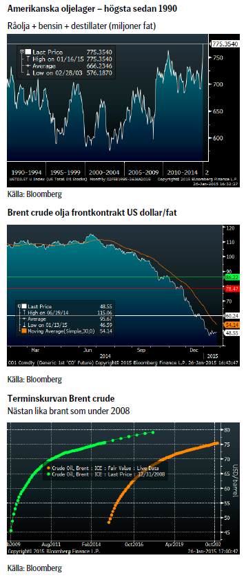 Grafer på oljaBrentoljan är ned 3,5 procent sedan måndagen den 19 januari och det i tid närmaste månadskontraktet handlas på 48,3 US-dollar per fat. De amerikanska oljelagren fortsätter att öka och är nu på den högsta nivån på minst 30 år. Det förväntas finnas överskott av olja genom hela första halvåret 2015 med fortsatt stigande lager både i USA och internationellt. Vi ser ingen anledning till att OPEC kommer att intervenera under första halvåret 2015. Heller ser vi ingen anledning att de kommer intervenera på sitt nästa möte, den 5:e juni. Ett eventuellt beslut att minska produktionen kommer inte att komma förrän i slutet av 2015; under november/december. Det är dock lite som tyder på att vi ska få en uppgång i oljepriset på kort sikt givet den fundamentala situationen. Vi tror att vi kommer att se 40 US-dollar per fat under det första kvartalet 2015. Anledningen till detta är att det antagligen finns tillräckligt tillgänglig lagerkapacitet i marknaden för att lagra överskottet av olja under första halvåret.