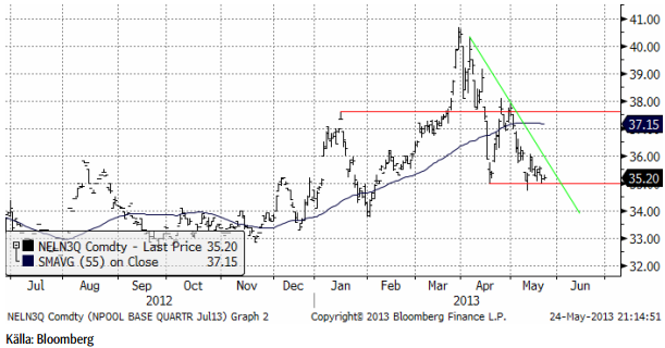 Elen har konsoliderat sig över 35 euro per MWh. Eftersom inget brott åt något håll har skett ligger vi kvar, men följer på i den riktning som utbrottet sker.