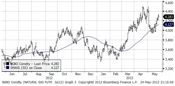 Naturgasen vände upp och är i stadig trend nu. Därför rekommenderas en köpt position, t ex genom BULL NATGAS X4 S.