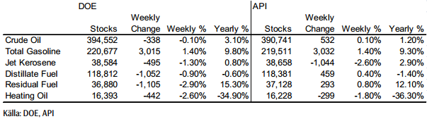Lagren och lagerförändringarna i USA den senaste rapportveckan (som slutade den 10 maj) ser vi nedan, enligt Department of Energy och American Petroleum Institute.