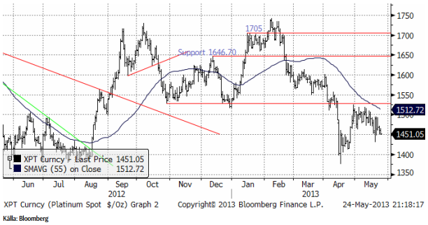 Platina började veckan med att rekylera upp från 1450, men trenden (nedåt) tog över och vid slutet av veckan var priset återigen nere vid 1450. Den här nivån var toppen på konsolideringen efter det kraftiga prisfallet i mitten av april och därför ett visst tekniskt stöd. Marknaden står nu och väger. Antingen får vi se en trendvändning uppåt, eller så fortsätter priset i den fallande pristrenden.