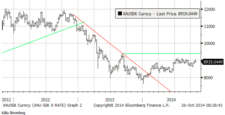 Chartet för guld i kronor har stigit från 8896 kronor per uns förra veckan till 8919 kronor, men handlades i veckan över 9000. Det är dock inte något ”tryck” i marknaden och uppsidan begränsas av tekniska motstånd strax över 9000 kr.