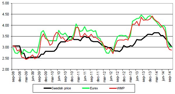 Arla meddelade i veckan att de behåller sitt pris oförändrat. Bakom det beslutet ligger förmodligen en gissning att marknaden håller på att bottna ut. Vi kan se att börspriset för mjölk, basis EUREX SMP och smör, ligger på 3 kr. Normalt sett är Arlas pris ca 40 öre lägre än priset på produkterna, vilket alltså skulle ge ett ARLA-pris på 2.60. Men studerar vi vad som hände med priserna vid den förra prisbotten sommaren 2012, ser vi att skillnaden mellan ARLA och börspriset krympte. Vi skulle ändå tro att ARLA kommer att behöva sänka ytterligare minst en gång och behålla priset lågt. Om de väljer att inte sänka priset kommer det att finnas behov av att behålla priset lågt längre tid än annars.
