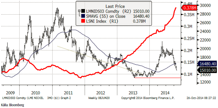 När vi talade med folk i London under LME-veckan, märkte vi att nickelkonsumenterna hade en annan bild av framtiden än de flesta banker och mäklare. Analytikerna förväntar sig att priset nästa år ligger mellan 20,000 och 24,000 dollar per ton. Man måste medge att det är rätt optimistiskt med tanke på att 3-månadersterminen stängde på 15,000 dollar i fredags. Vi delar analytikerkårens prisprognos för att det Indonesiska exportembargot bör skapa ett betydande underskott i marknaden, vilket innebär att det blir brist på metall. Just nu skiner dock bristen med sin frånvaro. LME-lagren (röd linje i diagrammet) verkar fyllas upp i en allt snabbare takt. Vår erfarenhet är dock att industrin kan vara lite kortsiktig och tänka att om utbudssidan ser bra ut de närmaste kvartalen, så är allt ”OK”. När man talar med företrädare för industrin (nickelkonsumenter) säger de sig se ett högre pris än idag, men inte alls lika högt som många bankers analytiker förutspår. Tiden får utvisa vem som har rätt.