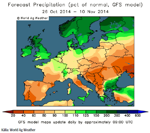 Av förra veckans regn över centrala och östra Europa i prognosen finns nu inget kvar. Endast över Norden väntas det fortsatt regna 150 – 300% mer än normalt. Även Storbritannien väntas få mer regn än normalt, medan södra Spanien, Italien och Nordafrika är fortsatt torrare än normalt.