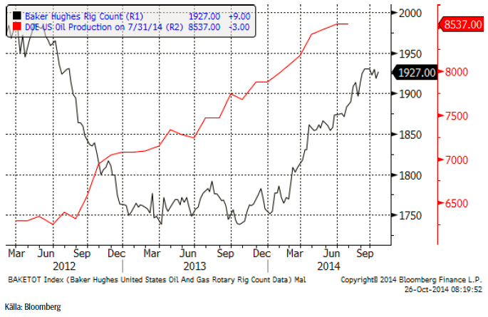Nedan ser vi ett diagram på antalet oljeriggar i USA, enligt Baker Hughes statistik (svart) och USA:s oljeproduktion enligt US DOE på 8.537 mbpd, i grafen som slutar i juli. Antalet borr-riggar i drift ökade med 9 från 1918 förra veckan till 1927 enligt fredagens statistik. Det lägre oljepriset har alltså ännu inte påverkat entusiasmen hos oljeletarna i USA.