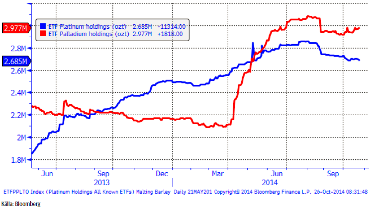 Nedanför ser vi hur mycket metall som finns i börshandlade fonder för platina respektive palladium. Investerare fortsätter att sälja av platina och att köpa palladium.