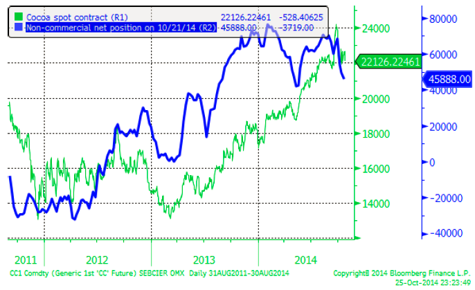Priset på kakao avslutade veckan med att falla ganska kraftigt. Vi ser också att spekulanter (den kategori placerare som gör analyser av framtida utbud och efterfrågan och försöker lista ut om priset är rätt givet detta), minskat sin köpta position ytterligare. I veckans rapport hade non-commercials sålt 3700 kontrakt och minskat den köpta positionen till netto 45,900 kontrakt köpt.