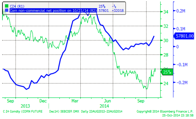 Nedan ser vi en bild på prisutvecklingen (grön kurva i cent) och non-commercial position i antal kontrakt i blå kurva.