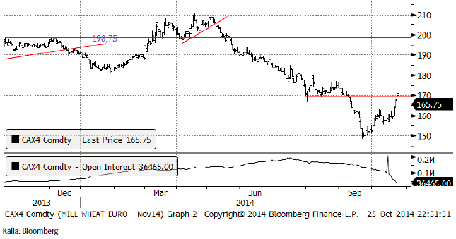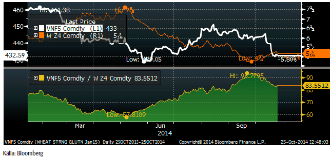 Matifs novemberkontrakt har stigit kraftigt i relation till Chicagovetet omräknat till euro. Orsaken till detta är nog till övervägande del rushen att komma ur korta positioner och Matifs ensidiga höjning av säkerhetskravet för dem som är sålda terminer.