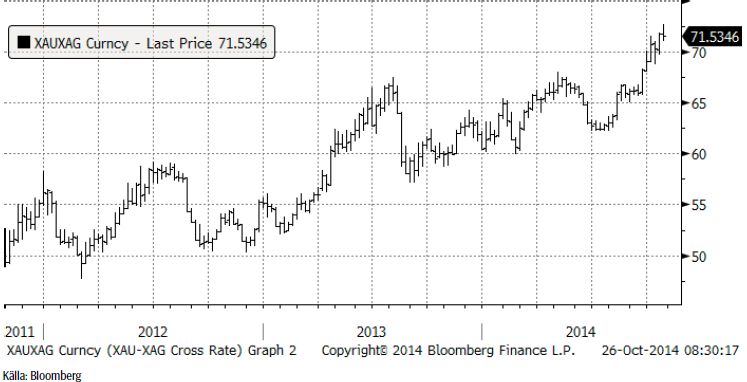 Kvoten mellan guldpris och silverpris är ungefär densamma som förra veckan på 71.5. På lång sikt ger det ett lågt pris på silver i förhållande till guld.
