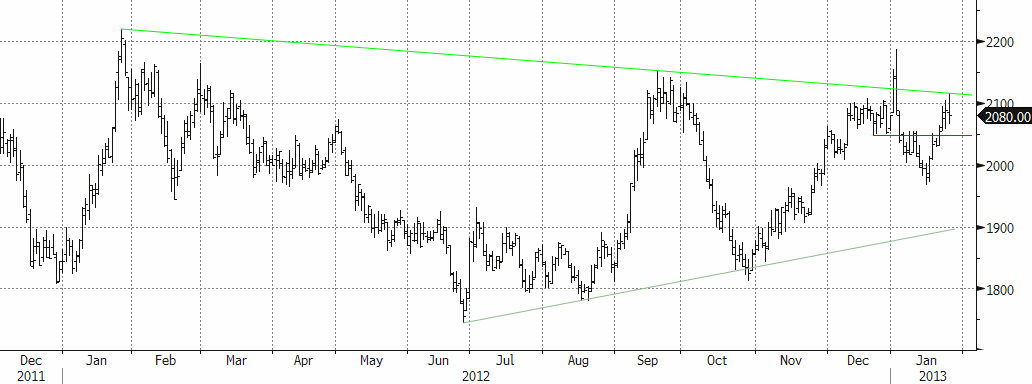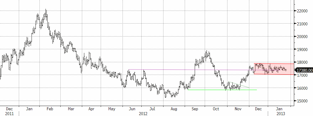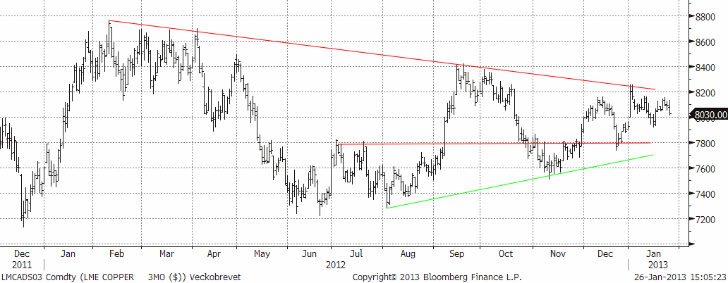 De senaste fundamentala rapporter vi tagit del av tyder på en marknad i balans under Q1 2013, detta tack vare att vi är inne i den säsongsmässigt starka perioden. Studier som genomförts styrker vår anekdotiska erfarenhet att perioden nov-april brukar innebära ökad efterfrågan (och stigande nickelpris). Problemet just nu är att utbudet är lite för överhängande för att ge tillräcklig hävstång på priset (detta bekräftades av produktionsdata i veckan). Nickel kan dock erfarenhetsmässigt ofta överraska med sin prisrörlighet. Den tekniska bilden ser generellt positiv ut med en tendens till ”högre bottnar”. Det blir viktigt hur marknaden beter sig i intervallet $17000 och $18000. Det viktigt att den nedre nivån håller för att hålla uppe tempot. Bryter det på uppsidan kan det ta ordentligt fart, med ett kortsiktigt mål på $19000.