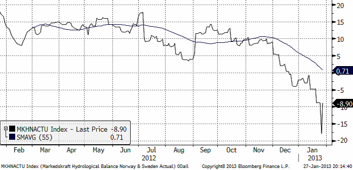 Baksidan av prisfallet i utsläppsrätterna är att potentialen för ytterligare prisfall är begränsad av nollan. Det ger också ett visst stöd för marknaden. Den hydrologiska balansen föll i veckan ner mot -18 TWh, men ligger nu enligt Markedskraft på -8.9 TWh.