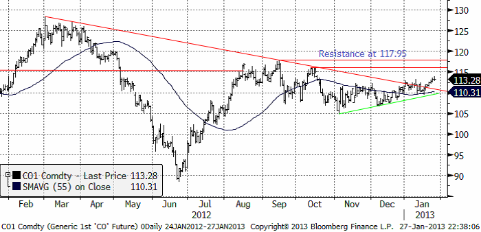 Efter att ha brutit den nedåtgående motståndslinjen för över en vecka sedan, fortsatte oljepriset att stiga. Nästa motstånd väntar vid 116.89 dollar. Huvudmotståndet ligger som vi ser i diagrammet nedan vid 117.95 dollar. Fundamentalt ger den ökning i efterfrågan man kan förvänta sig när global ekonomi hämtar sig. Som vi sett ovan visar PMI-statistiken en bild som stämmer överens med ”sen recession”. Saudiarabiens produktionsminskning ger stöd. Goda inkomster i Saudiarabien, och övriga delar av den arabiska delen av OPEC, kallat AOPEC, ger möjligheter att skydda länderna mot de upprorsbrasor som uppstår här och var i den arabiska världen.