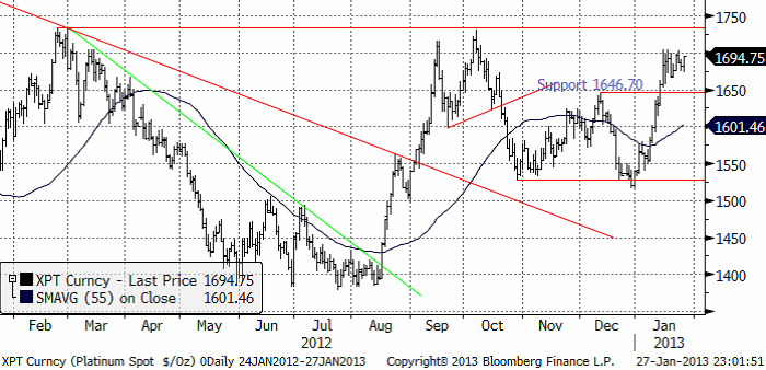 Platina har konsoliderat prisuppgången i två veckor. En växande efterfrågan från biltillverkning, framförallt i Kina, ger stöd förpriset. Motsvarande efterfrågefaktor saknas för guld och silver. En återhämtning i global ekonomi verkar stödjande för platina, men eftersom oron för statsfinansiell bankrutt minskar, får detta en negativ effekt på priserna på silver och guld. Ska man vara köpt en ädelmetall är därför platina att föredra.