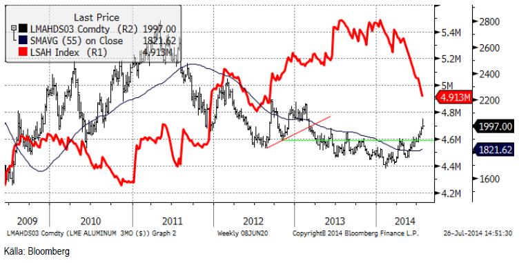 Lagren av aluminium på LME har sjunkit med 10% sedan i april. Mycket tyder på att detta till stor del beror på att tackor flyttats från LME:s lagerhus, som är relativt dyra, till billigare lagerhus utanför LME. Konsumtionen tycks emellertid vara stark och det råder en viss brist på metall utanför Kina. Konsumenterna är dock inte aktiva på LME, utan det är framförallt hedgefonder som är aktiva på köpsidan. Det förekommer viss hedging från producenter och marknaden väntar sig mer av detta om priset fortsätter att stiga.