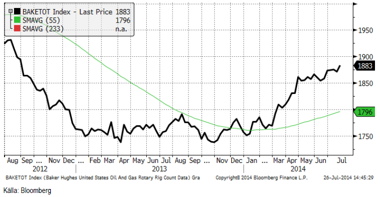 Nedan ser vi ett diagram på antalet oljeriggar i USA, som fortsatt att stiga enligt Baker Hughes statistik.