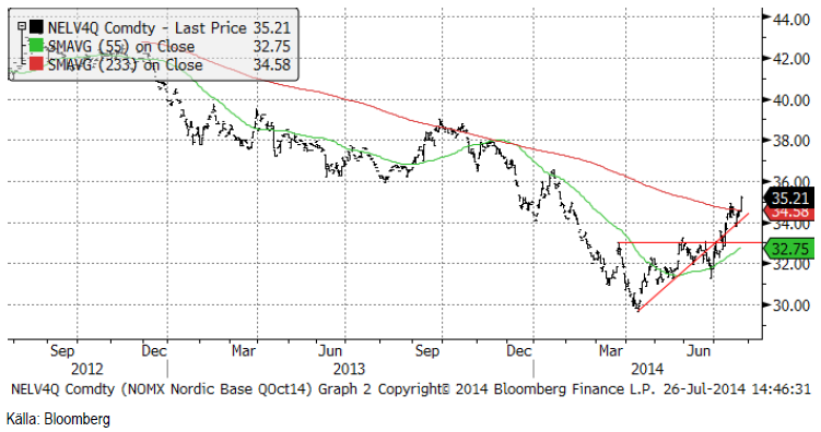 Trenden i elpriset är uppåtriktad och vi tror att det finns ytterligare potential uppåt. Vid 36 euro finns dock ett relativt kraftigt tekniskt motstånd. Risk / reward gör att vi rekommenderar neutral position.