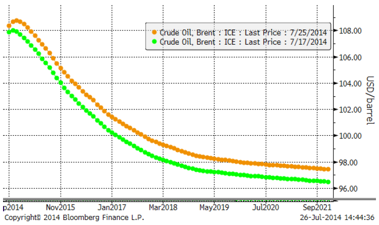Terminerna på brentolja har gått in i contango för de närmaste månaderna. För längre löptider råder dock fortfarande backwardation. Det kan vara värt att notera att marknaden handlat upp de riktigt långa terminer till 98 dollar för år 2020.