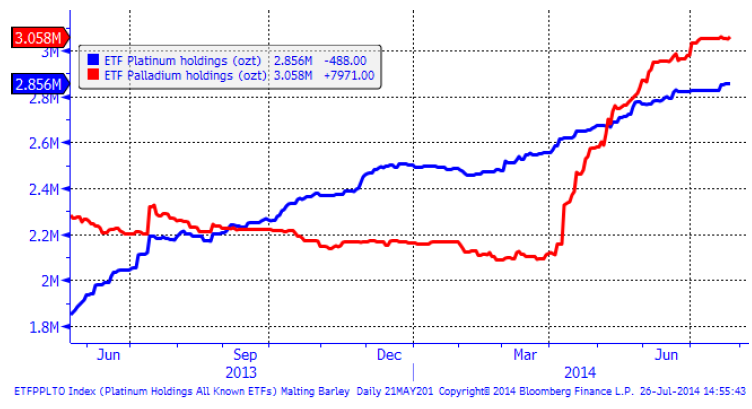 Nedanför ser vi hur mycket metall som finns i börshandlade fonder för platina respektive palladium.