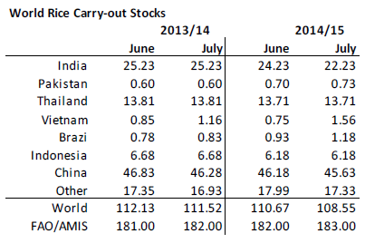 Pga lägre produktion erhåller USDA ett estimat för utgående lager som är lägre. Konsumtionen påverkas inte mycket av de väderfaktorer som påverkat produktionen. Inte heller FAO/AMIS har förändrat sitt estimat på konsumtionen 2014/15 utan behåller den på 502 mt. FAO:s estimat på 1 mt högre produktion leder därför till 1 mt högre utgående lager i deras rapport.