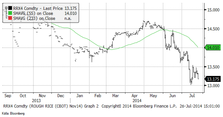 Priset på ris (novemberkontraktet på CME) har fortsatt falla den senaste månaden. Vi tror att prisfallet fortsätter, då risken för ett El Niño, som skulle kunna orsaka torka i Sydostasien, har minskat ytterligare.