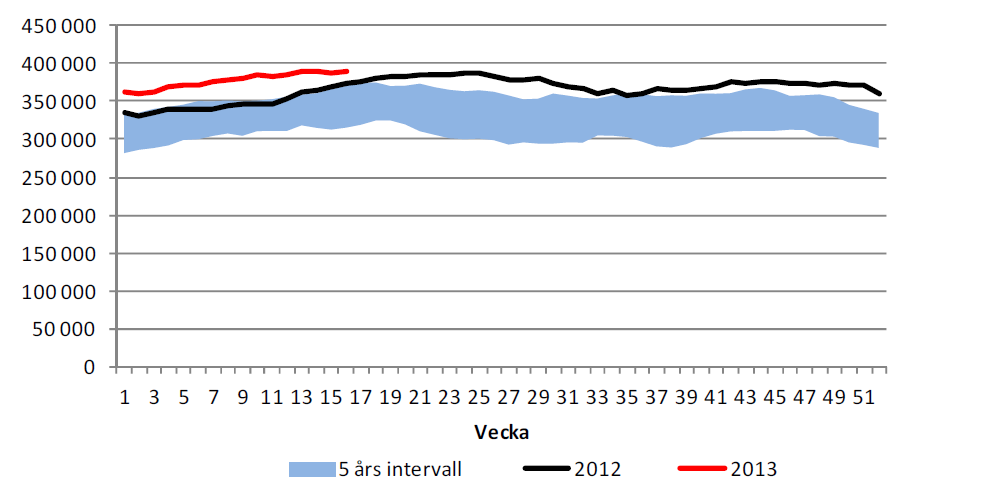 Nedan ser vi amerikanska råoljelager enligt DOE i tusen fat. Den svarta kurvan är 2012 års lagernivåer vecka för vecka och den lilla röda linjen är 2013 års nivå.