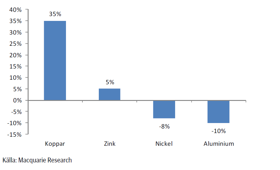 Som vi skrivit tidigare tyder mycket på ökat utbud för koppar, vilket riskerar att begränsa uppgångspotentialen. Vi rekommenderar fortsatt en neutral position, men sätter koppar på bevakning för köp. För den som vill satsa på ett starkare tillväxtscenario (än konsensus) i Kina är koppar däremot alltid ett intressant alternativ.