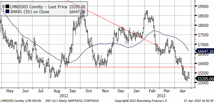 Även nickel följde den allmänna trenden under veckan. Metallen balanserar farligt nära de viktiga stödnivåerna. Det finns ett lite oroväckande negativt stämningsläge kring nickelmarknaden just nu, baserat på känslan av ett alltför stort överskott (LME-lagret är ett synligt tecken på detta). Den rostfria stålindustrin som förbrukar ca 60 % av allt nickel, vill inte riktigt ta fart. Den förväntade lagerbyggnadsfasen har inte materialiserats under Q1, som den normalt gör. Problemet är delvis att tillgången i Kina är alltför god med tanke på utbudet av nickel Pig Iron. Det kan därför ta lite längre tid än beräknat. Vi bedömer ändå nivåerna som väldigt intressant ur ett kostnadsperspektiv (den första produktionen som förväntas tas ur marknaden är just Nickel Pig Iron i Kina). Frågan är om det finns utrymmer för ett brott om $15000. Vi studerar därför det långsiktiga veckodiagrammet nedan. Med nuvarande fundamentala situation har vi väldigt svårt att se marknaden gå ner till 2008-års katastrofnivåer (då efterfrågan mer än halverades). Om vi får en dipp under $15000 tror vi den blir kortvarig, och ett ypperligt köpläge av en metall som på sikt har stor uppgångspotential.