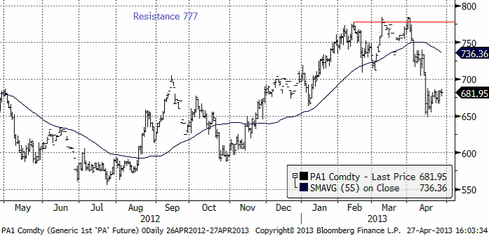 Prisfallet i palladium har stannat av och inte lyckats ta sig uppåt. Det ser ännu svagare ut än de andra. Vi tvingas därför vänta fot och gå kort. Rekommendationen ändras alltså till köp av BEAR PALLAD X4 S. Målkursen är 600 dollar.