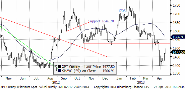 Platinapriset har rekylerat uppåt, i likhet med guld och silver. Vi tror att det handlar om en rekyl mot den allmänna pristrenden och därför ett bra tillfälle att temporärt stänga positioner i Platina.