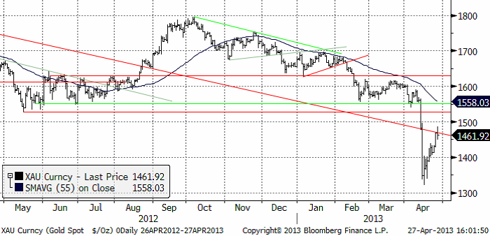 Produktionskostnaden ligger strax under dagens pris. Gruvbolaget Newmont säger att ”all-in sustaining cash costs” är 1,100 – 1,200 dollar / ozt. Barrick säger att det är 1,000 – 1,100 dollar. IamGold, som är en högkostnadsproducent, ligger på 1,558 dollar. Det kanadensiska bolaget Dundee Capital Markets gjorde en sammanställning av ”all-in cost”. De säger att medelvärdet för de 20 största producenterna är 1,306 dollar. På basis av en kostnadskurva publicerad den 4 april i ”GFMS Gold Survey 2013” kan vi utläsa att så mycket som 20% av alla gruvor är olönsamma vid den här prisnivån. Tendensen att minska utbudet och få marknadens utbud mer i balans med efterfrågan borde få priset att hitta stöd inte långt under dagens guldpris.