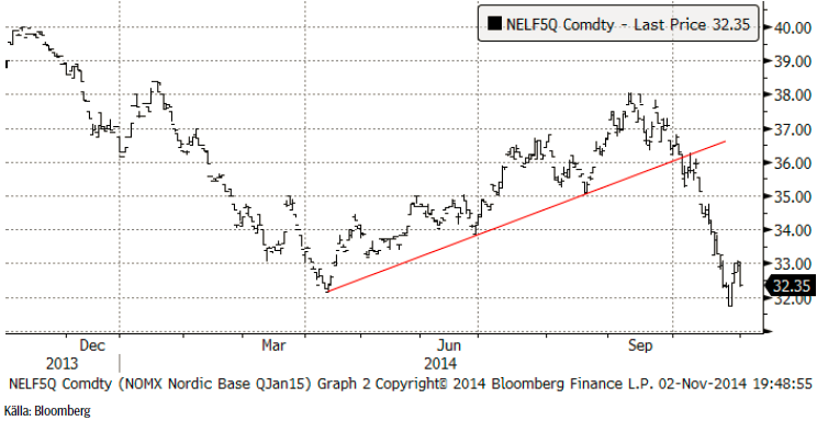 Vi rekommenderade förra veckan att ta hem vinsterna på den korta positionen. Tendensen i marknaden är dock fortsatt negativ. Skulle prisnivån 32 euro brytas, kan det vara aktuellt att gå kort igen.