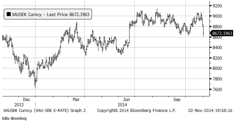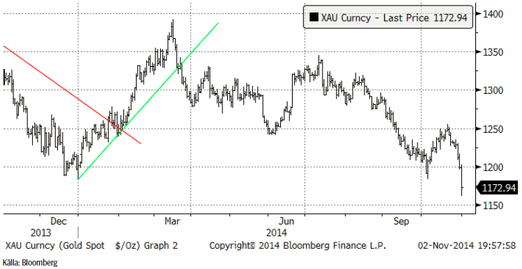 Guldpriset har tagit stryk av tre anledningar: För det första har QE3 avslutats i USA. Det var i och för sig helt väntat att FED:s nedtrappning av obligationsköpen skulle sluta nu. Nedtrappningen inleddes veckan före jul för nu nästan ett år sedan och nådde sitt slut nu. Den andra faktorn, som pressar guldpriset är att när FED senast uttalade sig om räntan, föreföll det luta lite mer åt räntehöjningar än tidigare. Tillväxten i USA överraskar också på den positiva sidan. På grund av såväl lite mer positiva utsikter för räntehöjning, hög tillväxt och allmän oro i världen, fortsätter dollarn att stiga mot andra valutor – och mot guldet. Med andra ord sjunker priset på guld uttryckt i dollar.