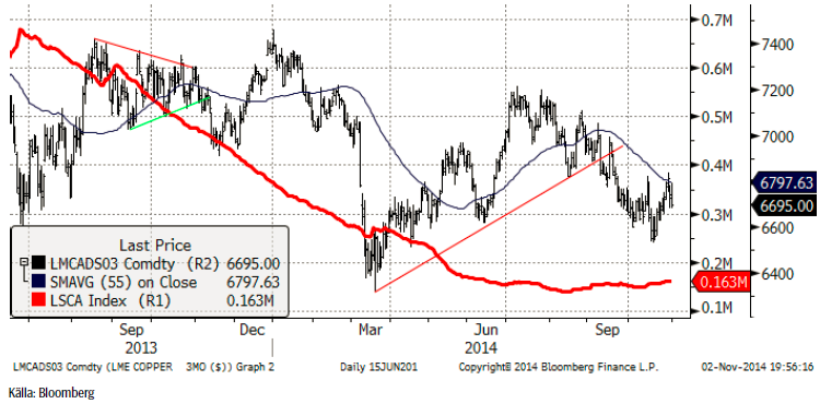 Med hög volatilitet handlades kopparpriset högre hela veckan. Från teknisk synvinkel, rekylerar priset den större, fallande pristrenden från början av året. Ur ett fundamentalt perspektiv är detta i linje med förväntningarna om att marknaden går från underskott till överskott. Enligt International Copper Study Group (ICSG) kommer år 2014 att uppvisa ett underskott på 307 kt, som vänds till ett överskott på 393 kt nästa år. Den här förändringen har ännu inte resulterat i en svagare marknad. Bristen på material på LME håller marknaden i ett hårt grepp. Cash till 3-månaders terminsnotering handlas i stadig backwardation på 60 – 70 dollar. Resten av terminskurvan uppvisar ungefär samma mönster. Den globala ekonomin har i någon mån stärkts den senaste tiden med mer stimulans och statistik från USA som visar att tillväxten är god. Säsongsmässigt är vi nu inne i det starkaste kvartalet. Vi behåller åsiken att det finns utsikter för högre pris på koppar resten av året.