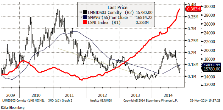 Det verkar som om marknadens aktörer vände fokus till den fundamentala situationen, och att det mesta av NPI-produktionen blir olönsam vid de här prisnivåerna på primärnickel. Om man beaktar den sämre filippinska malmen, som motsvarar en produktionskostnad på nickel på runt 20,000 dollar, verkar dagens nivå attraktiv. Vi hör talas om att långsiktiga investerare har börjat eller börjar utnyttja det låga priset som rekylen har gett upphov till, för att bygga en lång position. Tekniskt kan man säga att den branta rekylen något bröts av veckans handel och det ger i första hand en indikation på att man kan vänta sig ”sidledes” handel mellan 15,000 och 17,000 dollar per ton.