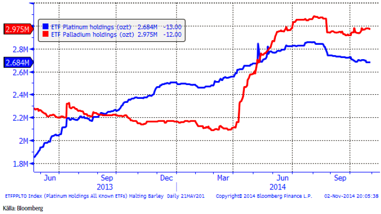 Nedanför ser vi hur mycket metall som finns i börshandlade fonder för platina respektive palladium. Investerare fortsätter att sälja av platina, men verkar behålla sitt palladium och till och med öka på den.