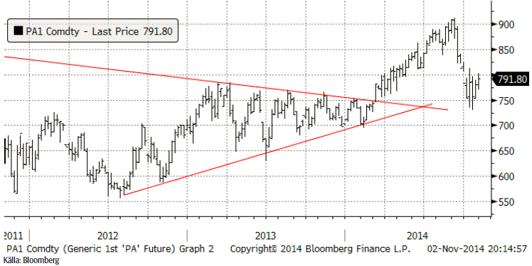 Både platina och palladium har befunnit sig i konsolideringsfas några veckor. I fredags verkade konsolideringen vara över för båda metallerna, men de ser ut att bryta ut åt olika håll. Medan platina föll kraftigt mot slutet av veckan, tillsammans med guld och silver, visade palladium styrka och verkar vara på väg att testa 900 dollar igen.
