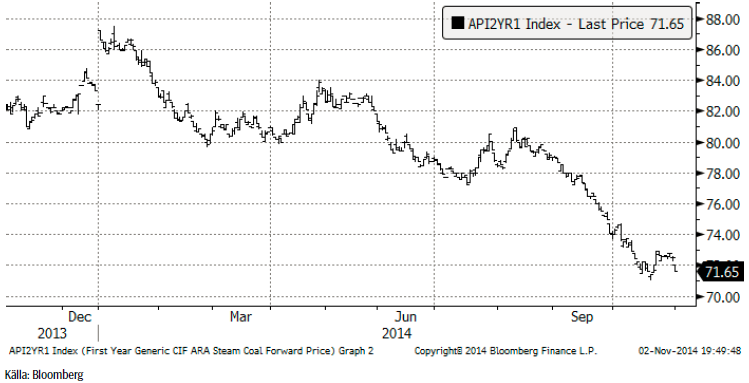 Nedan ser vi terminspriset för kalenderåret 2015 avseende energikol. Priset rekylerade uppåt från 71 dollar för drygt en vecka sedan, men detta vände inte trenden. Efter lite sidledes rörelse föll priset ganska kraftigt i fredags och stängde på 71.65 dollar per ton. Ett nytt test av 71 dollarsnivån verkar vara inom räckhåll.