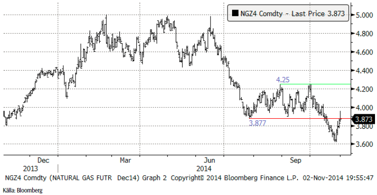 Naturgaspriset (decemberkontraktet) startade en rekyl från 3.60, som tog priset upp till 3.873 i fredags (strax under motståndet 3.877), även om priset var högre under fredagen. Tekniskt borde priset gå ner och vi håller därför fast vid BEAR NATGAS X4 S.