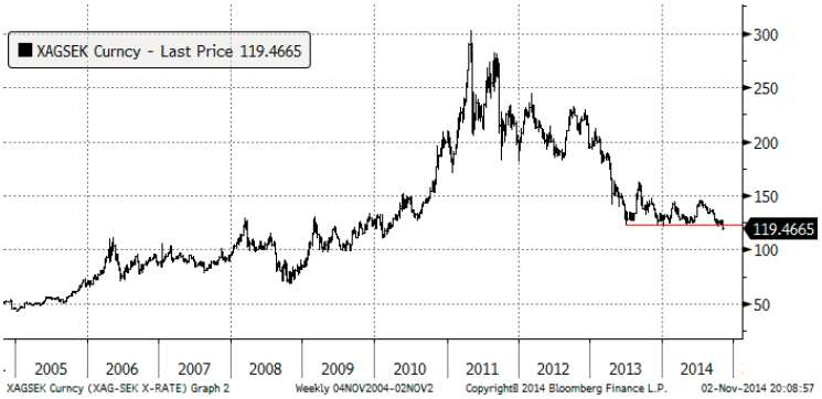 Silverpriset i svenska kronor har brutit stödet vid 123 kronor per uns. Nästa stöd finns nu vid 100 kr per uns, som agerade motstånd från 2006 och framåt och stöd från år 2009. Uppsidan är nu begränsad av 123 kr, som är det nya motståndet. Marknaden kommer att ha mycket svårt att ta sig över den nivån, med tanke på hur länge det fungerade som stöd.