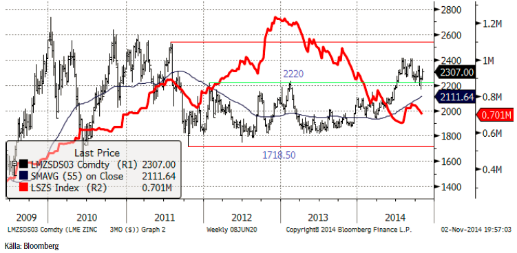 I motsats till aluminium, är den fysiska premien för zink inte förhöjd och den fysiska marknaden präglas inte av brist. Två teman har varit i fokus på zinkmarknaden i år. För det första verkar fonder och CTA:s gilla metallen, vilket beror på den positiva långsiktiga trenden som beror på gruvnedläggningar. De har handlat in och ut och hållit marknaden inom olika prisintervall. För det andra har uppsidan varit begränsad av prissäkring från gruvbolag. 2400 dollar verkar vara nivån. Vi har noterat den stadiga förbättringen av den fundamentala balansen, såsom rapporterat huvudsakligen av International Zink Study Group (ILZSG). Baserat på data därifrån förväntar vi oss ytterligare lagerminskningar och en stadigare positiv pristrend. Vår bedömning är att priset kommer att ligga i intervallet 2200 – 2350 dollar per ton under det fjärde kvartalet. Vi kan möjligen få se 2400 dollar (toppnoteringen från sommarmånaderna).